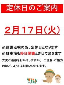 2026年2月17日(火)は設備点検のため、ウィラ大井・ウィラ大井2ともに定休日となります。